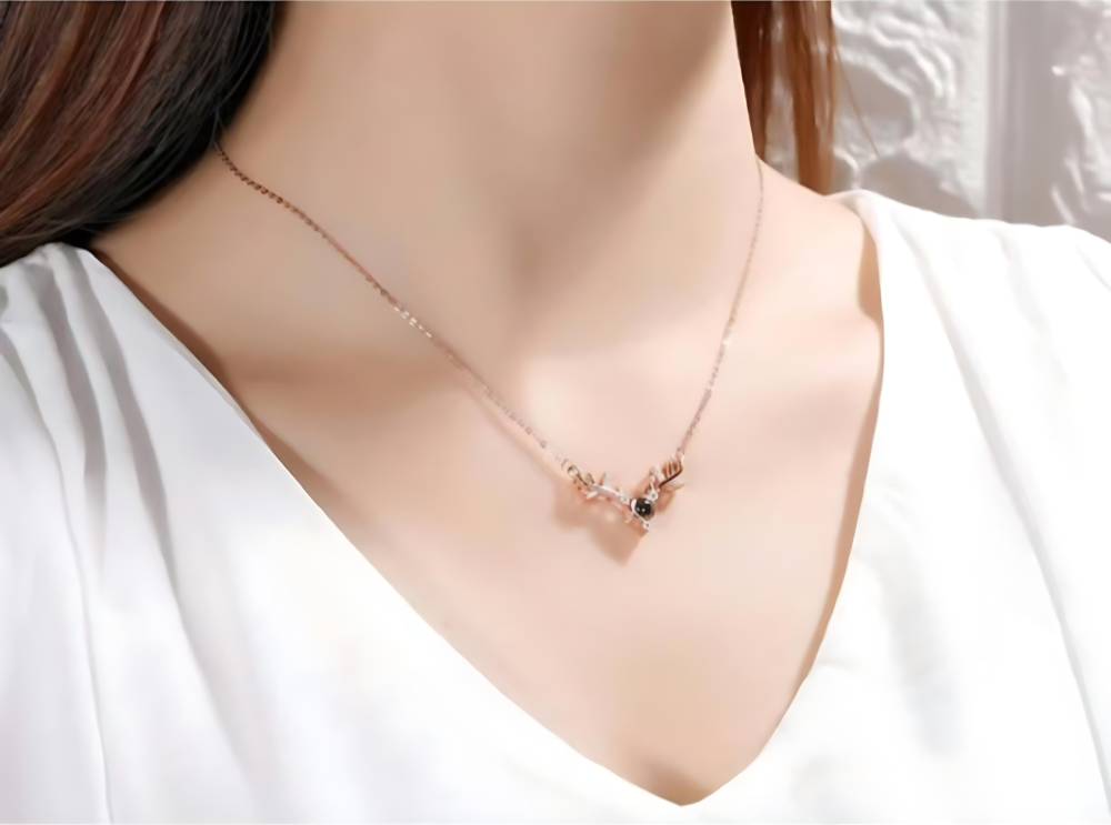• Custom Deer Antler Pendant – This necklace perfectly blends the spirit of a fawn with the sophistication of fine jewelry. A slender rose gold chain gracefully wraps around the neck. The pendant is shaped like a three-dimensional deer antler, its smooth lines embellishing the natural contours of the antler. The shimmering diamonds set into the antler, as clear as morning dew, add a radiant brilliance to the overall look.