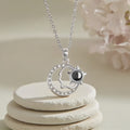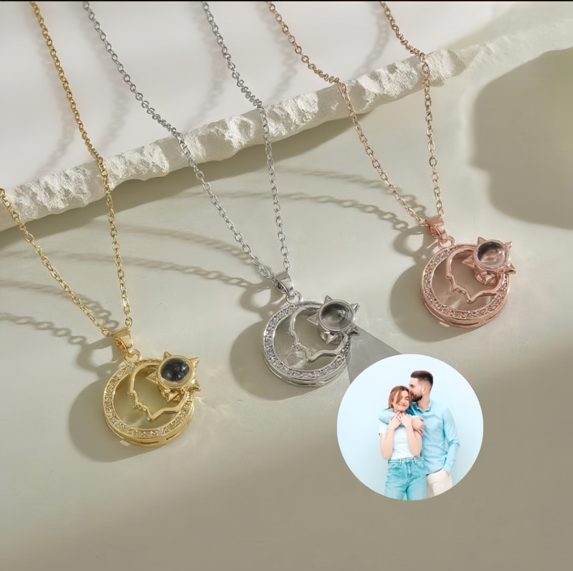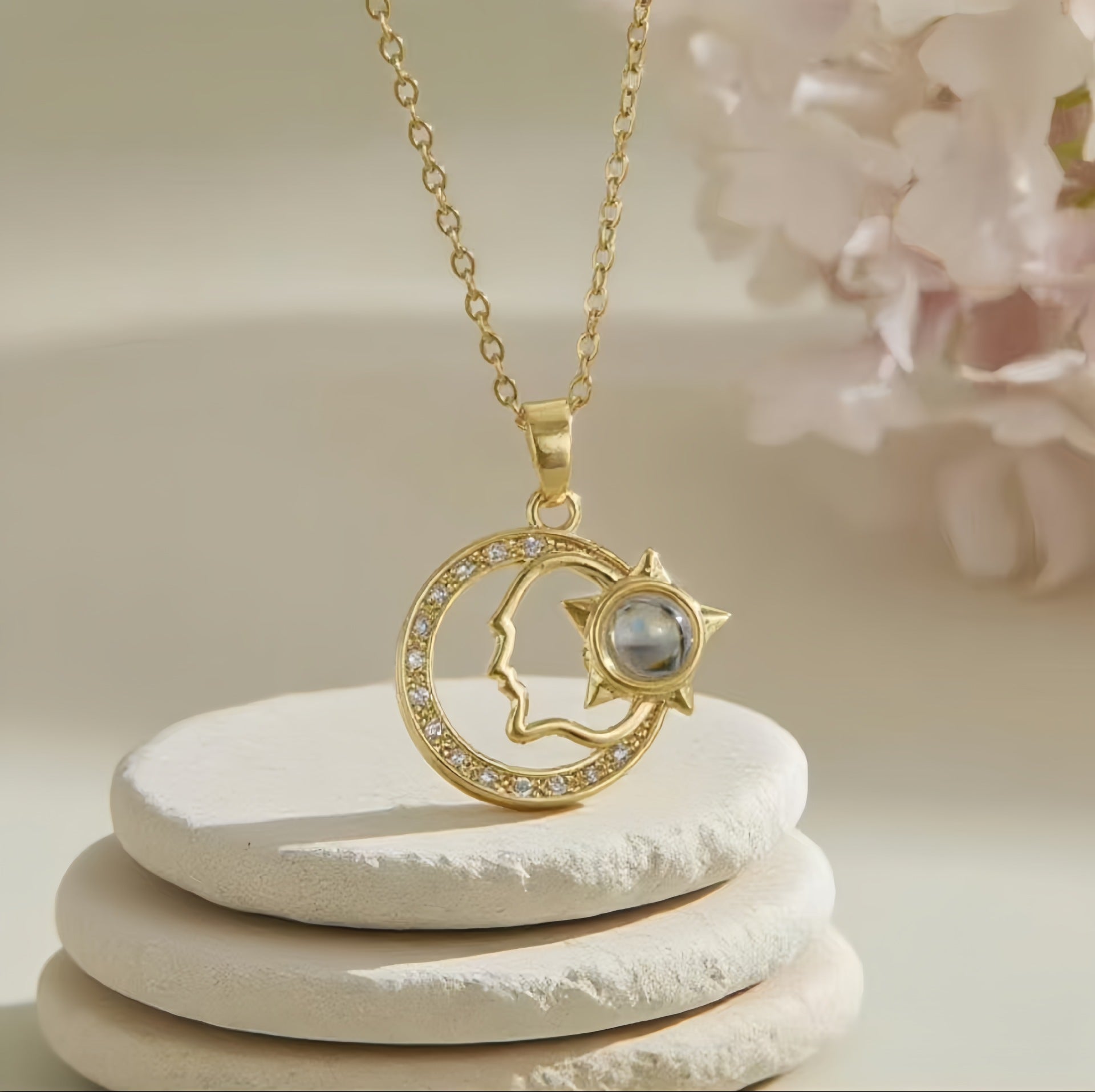 • Customizable Moon and Star Symbiosis Pendant – The crescent moon is encrusted with shimmering diamonds, reminiscent of the galaxy's shimmering light. A human face silhouette is cleverly cut out between the crescent moon, creating a truly artistic experience.